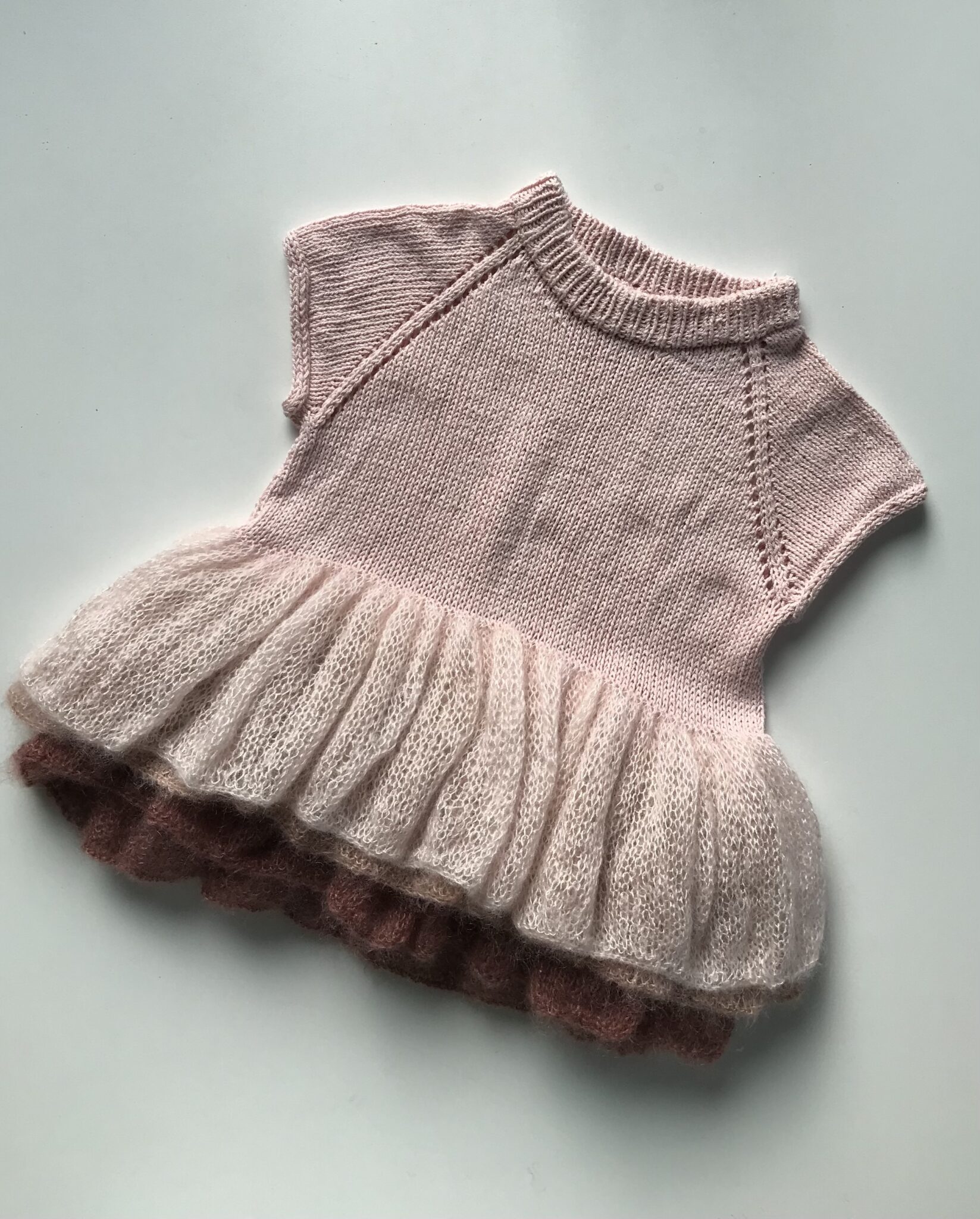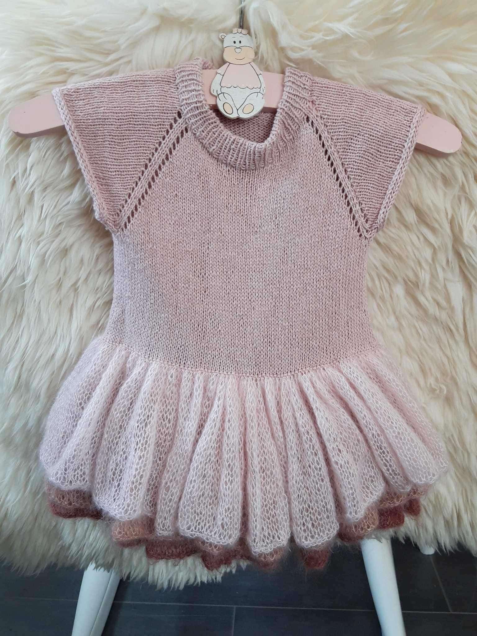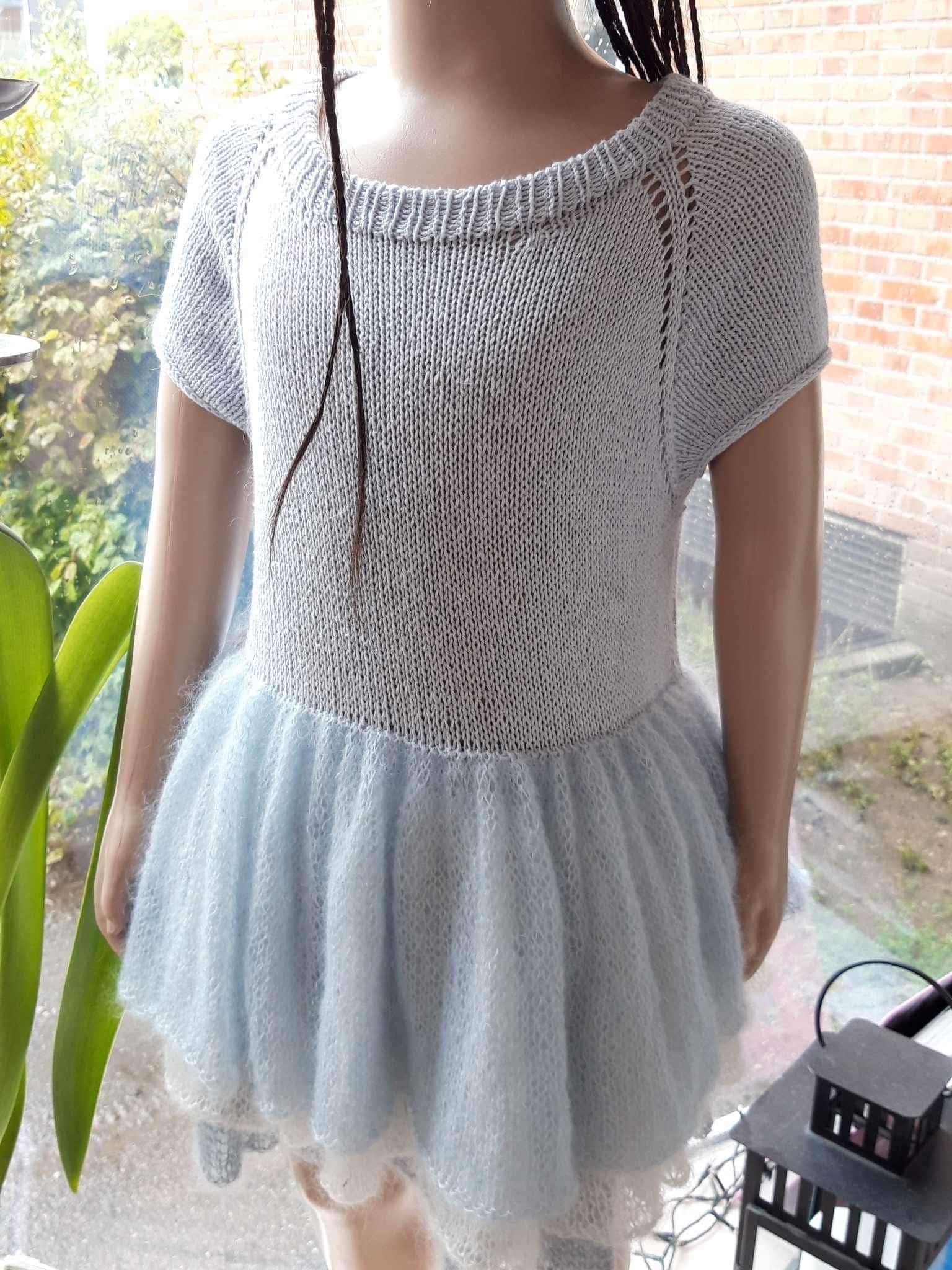 Ellas kjole strikkes rundt på rundpind fra midt bagpå. Der strikkes ovenfra og ned. Ærmerne strikkes rundt på strømpepinde/lille rundpind ovenfra og ned.