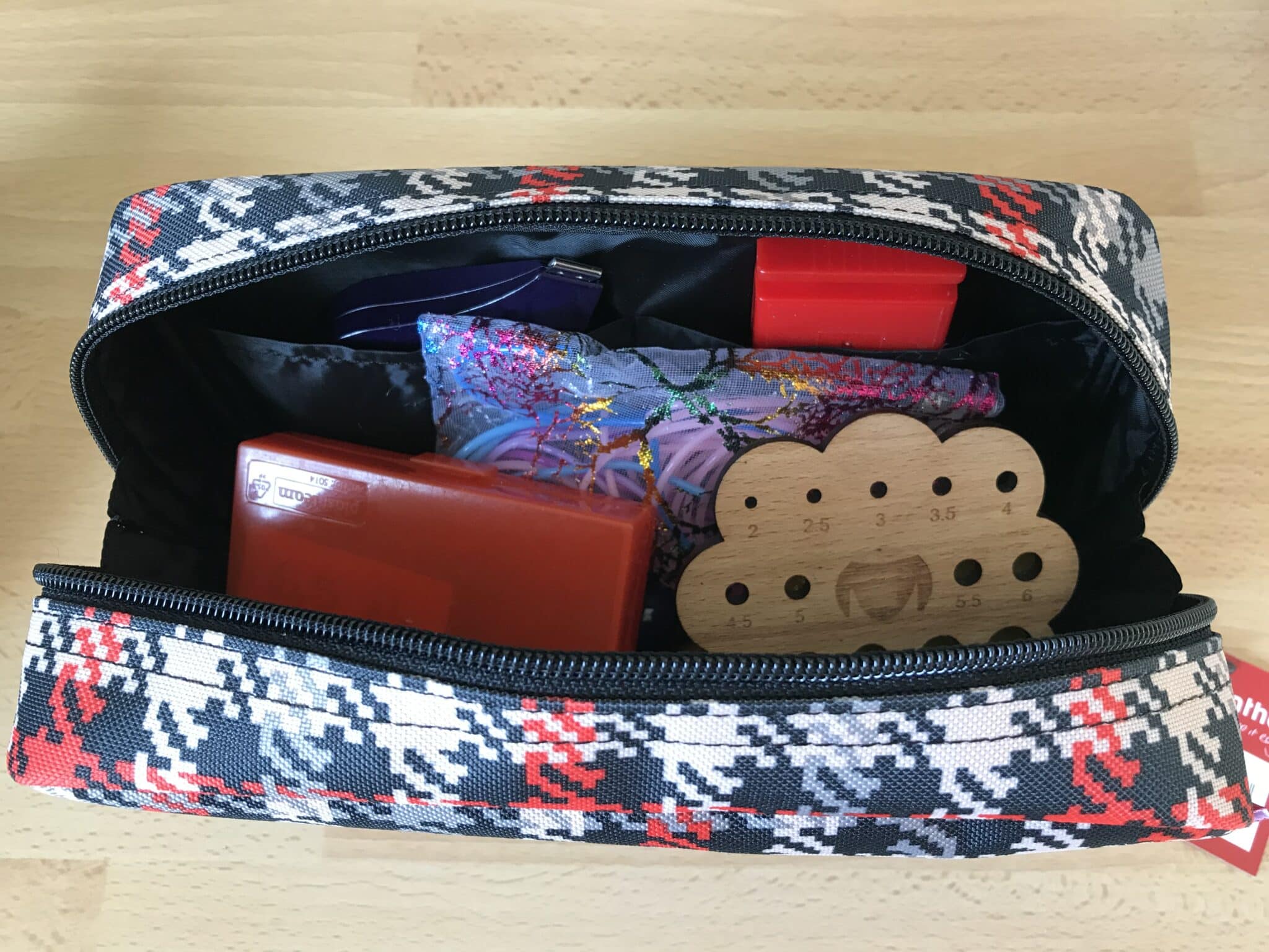 Den kan indeholde alle de fornødne småting man skal have ved sin side når man strikker